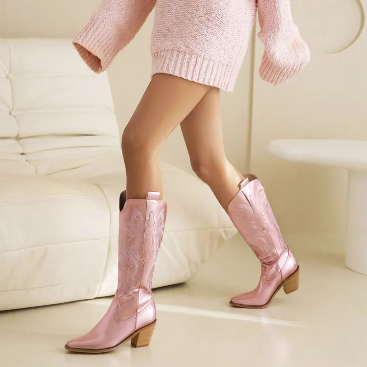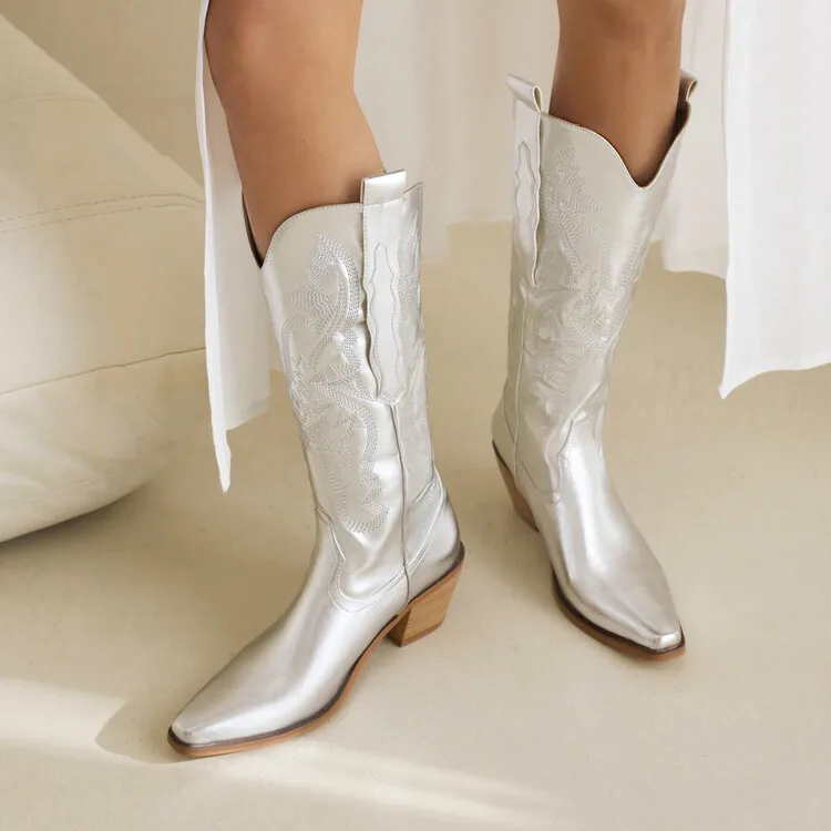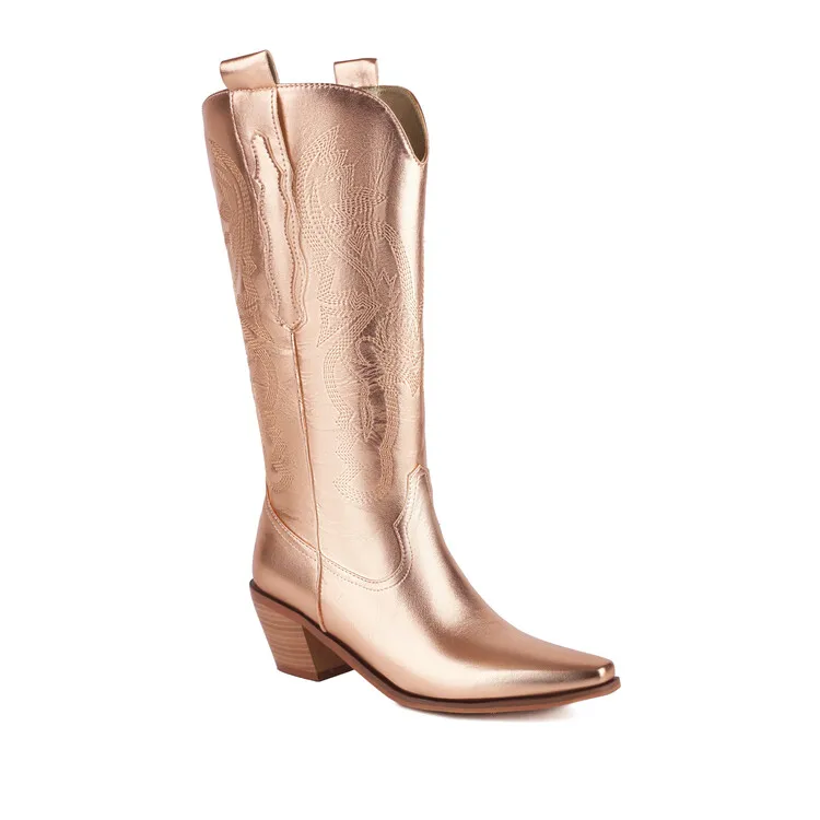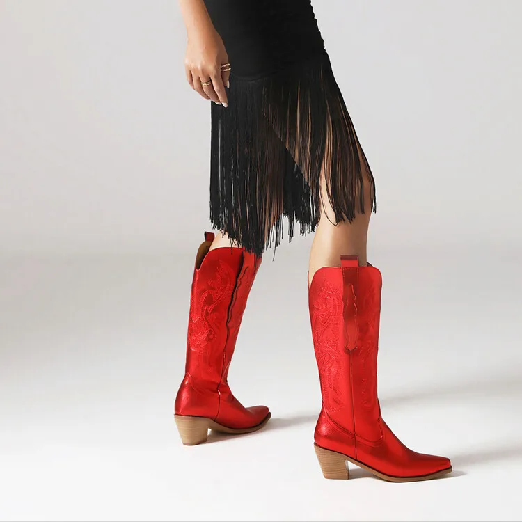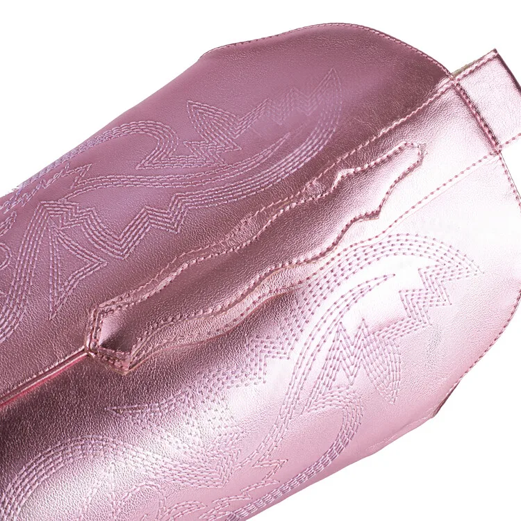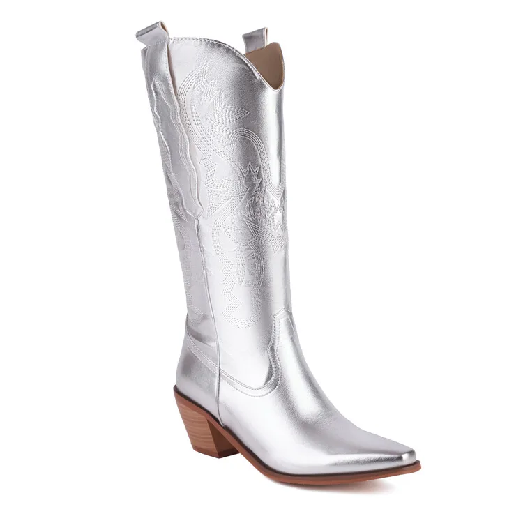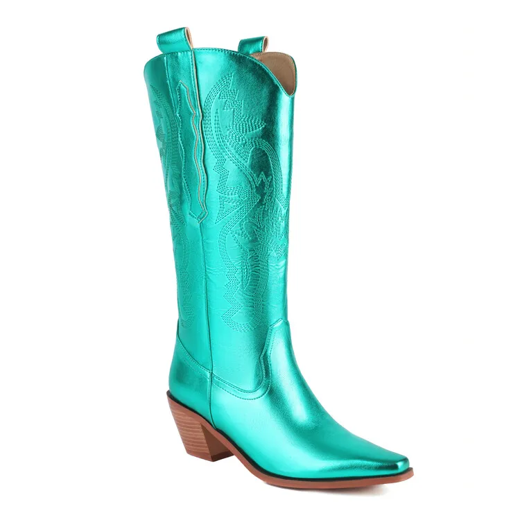 Ochanmeb Big Size 46 Women Knee-high Western Boots Silver Gold Slip-on Embroider Cowboy Boot Cowgirl Metallic Red Pink Blue Shoe